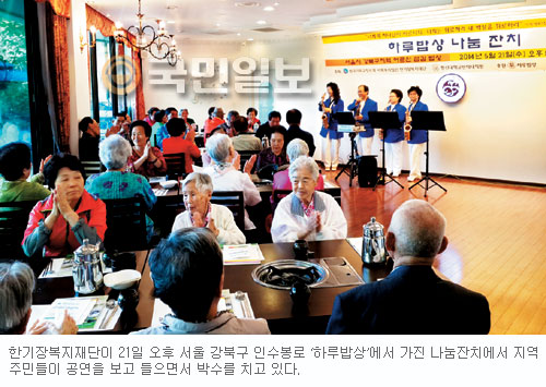 김이 모락모락 올라오는 밥 한 공기로 서로를 어루만지는 자리가 21일 오후 서울 강북구 인수봉로 ‘하루밥상’에서 열렸다. 한기장복지재단은 이날 지역주민 30여명과 ‘하루밥상 나눔잔치’를 열고 저녁식사를 함께했다.